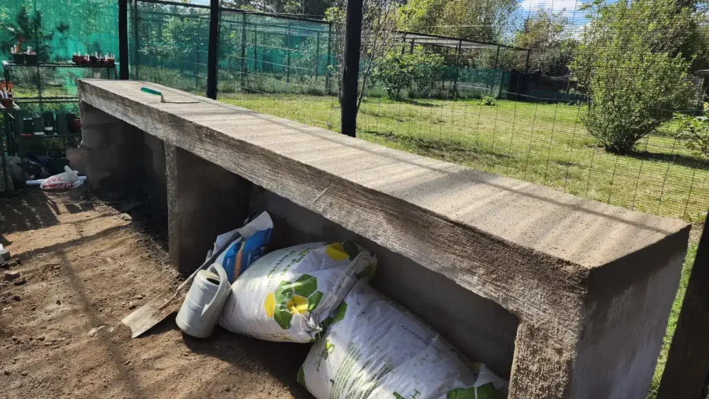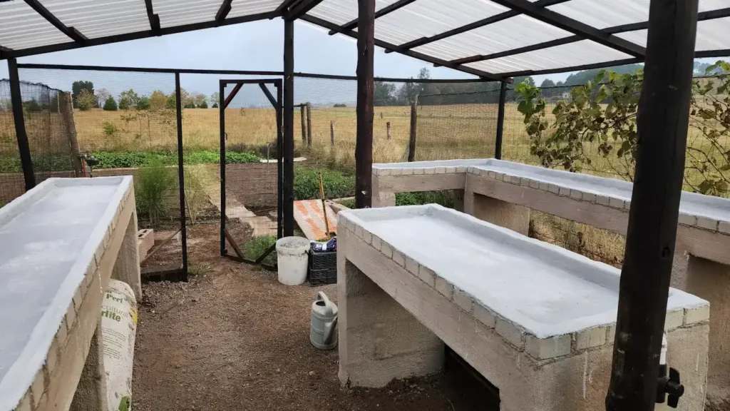 The table tops were sealed, small cobblestones added, drainage holes installed at the opposite ends for easy cleaning, and taps fitted at the front so I could fill the trays directly — no more lugging watering cans back and forth. Absolute game changer 😄