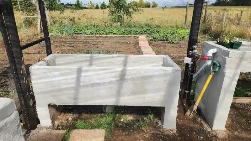 The garden measures 2m x 1m and fits perfectly between the entrance to the Dead Zone and the new tables holding my private collection. A tap was installed on the left for easy topping up of fresh water, and a drain on the right runs into the veggie garden behind — so no water ever goes to waste 🌱