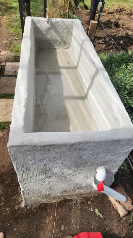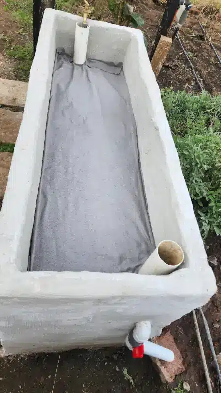 After waterproofing the interior, I placed four bricks at the base to create a water reservoir. This allows the entire system to be drained easily when needed, while also providing a constant supply of water that wicks up through the soil.