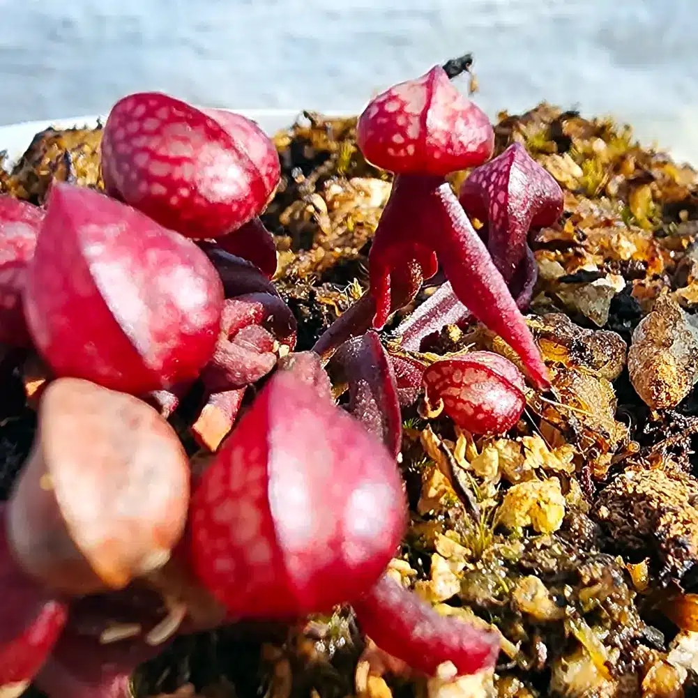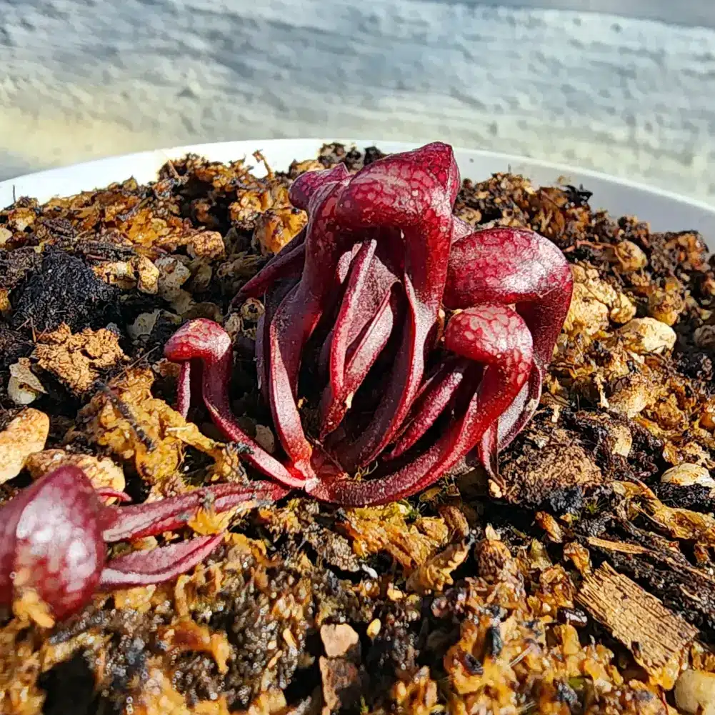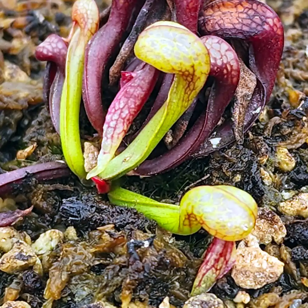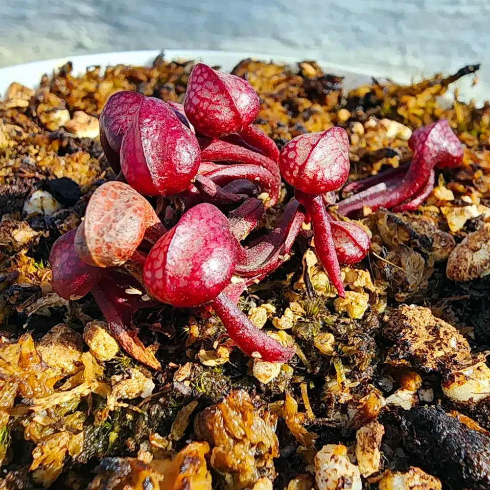 These plants are appr 2 years old, so they still have small pitchers and will take a few years to reach maturity. Pitchers are appr. 1cm in length but already displaying those beautiful fangs they are so famous for. These grow permanently under 40% shade cloth hence the deep red colouring of the pitchers.