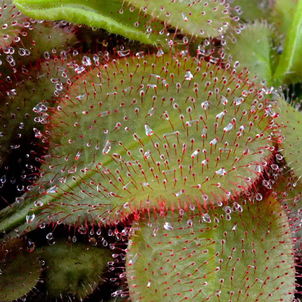 Sundews are part of the Drosera family and are relatively easy to care for so they are great for beginners. They are fascinating hunters, producing a glistening sticky dew on the leaves, which lure insects. When they land, they get glued to the leaf, and this glue starts to digest the insect. Cape Sundews are unique in that they curl their leaves around their victim enlarging the digestive area and digesting the prey much quicker.