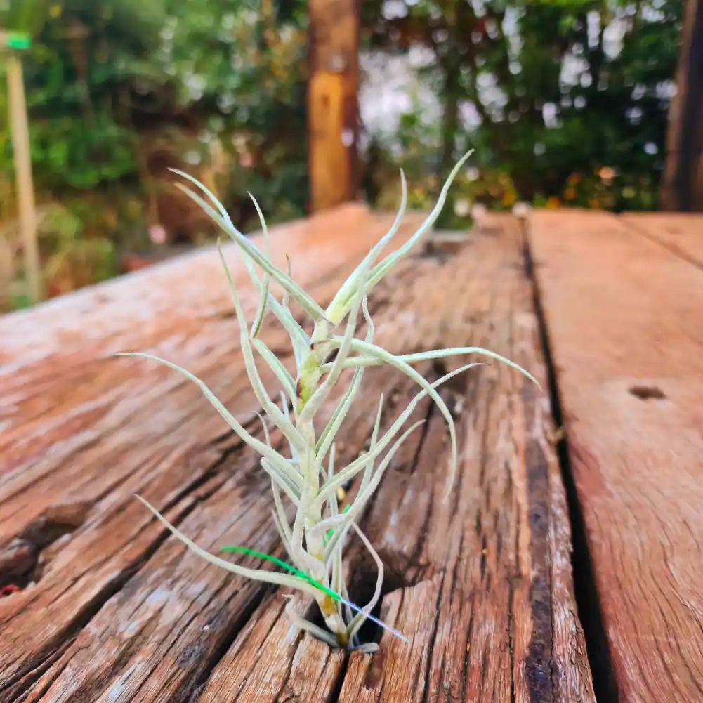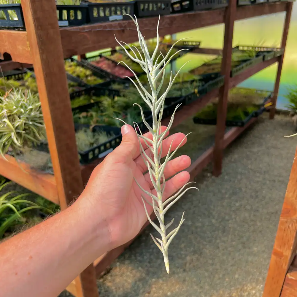 Tillandsia paleacea ‘Flaca’ is a beautifully textured air plant prized for its fine, curling leaves coated in a soft layer of silvery trichomes. The foliage forms a loose, airy rosette that feels light and cloud-like, giving the plant a wild, natural elegance that stands out without needing bold colour.